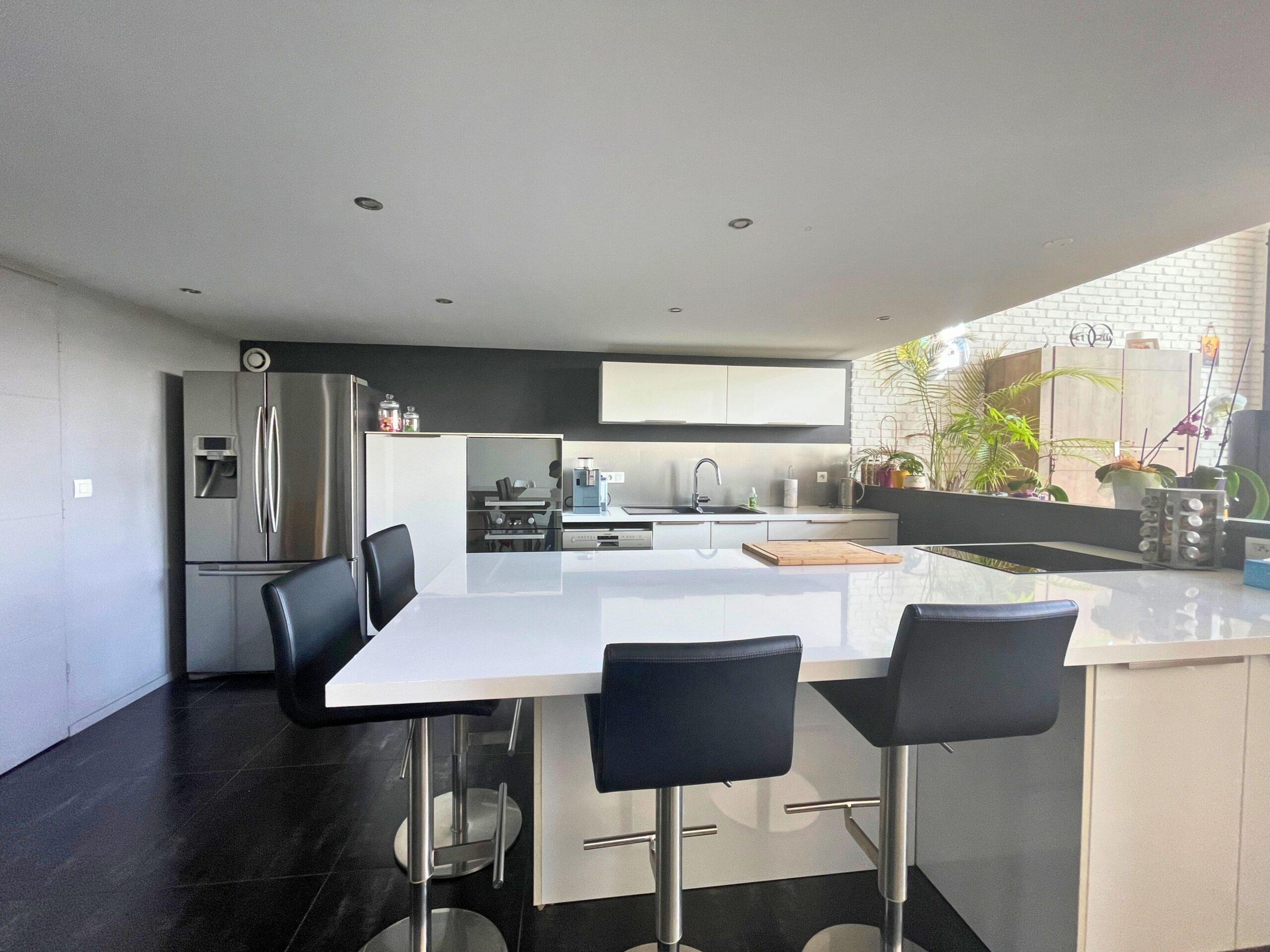 La pièce de vie de plus de 60 m² comprend un salon sur estrade baigné de lumière, une cuisine ouverte avec îlot central et frigo américain, et une salle à manger conviviale.