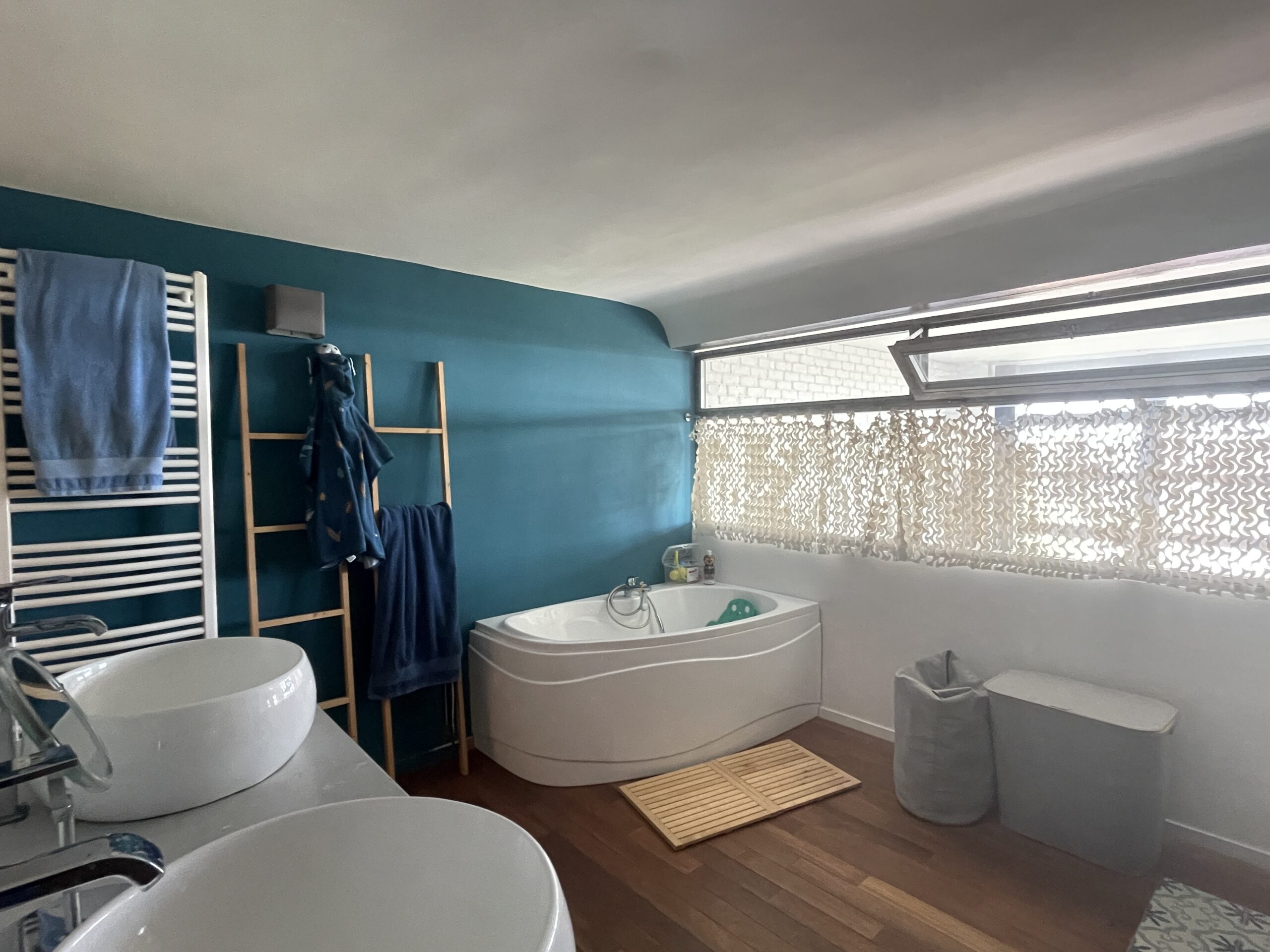La salle de bain est spacieuse et fonctionnelle, équipée d’une douche à l’italienne, d’une baignoire, et d’une double vasque.